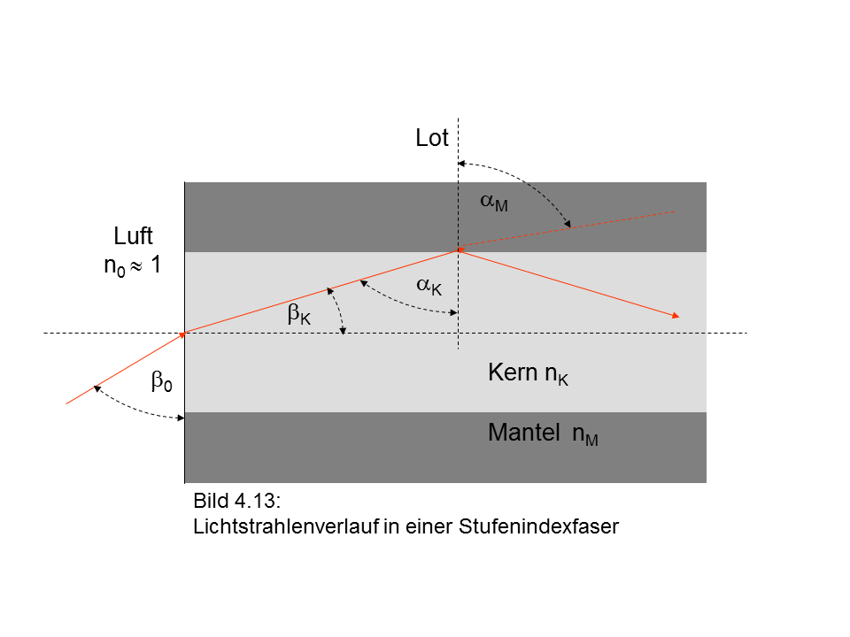 Bild 4.13 zeigt eine Strahlführung in einem Lichtwellenleiter mit Stufenprofil.